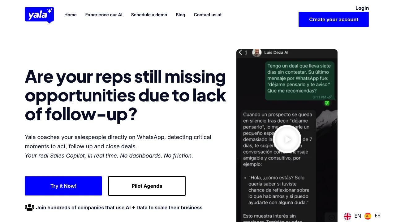 Yala 在 WhatsApp 上即時指導你的銷售團隊,偵測關鍵時機、建議行動、加速成交。首月提升 20% 活躍商機,縮短 40% 銷售週期。